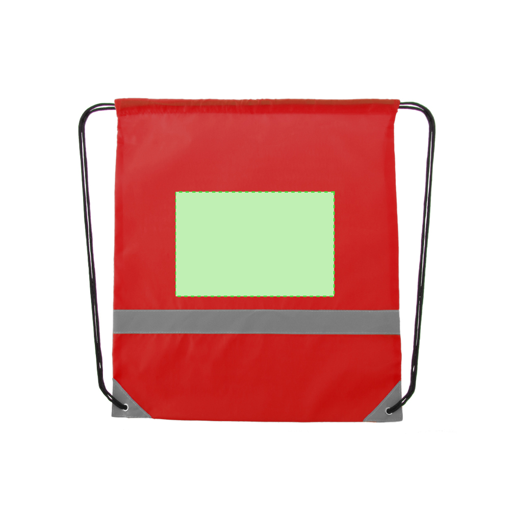 Reflecterende rugzak van zacht polyester 190T in diverse kleuren, met reflecterende strook aan de voorkant. Zwarte koordsluiting en reflecterende hoeken versterkt met metalen ringen.